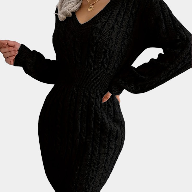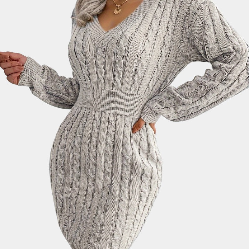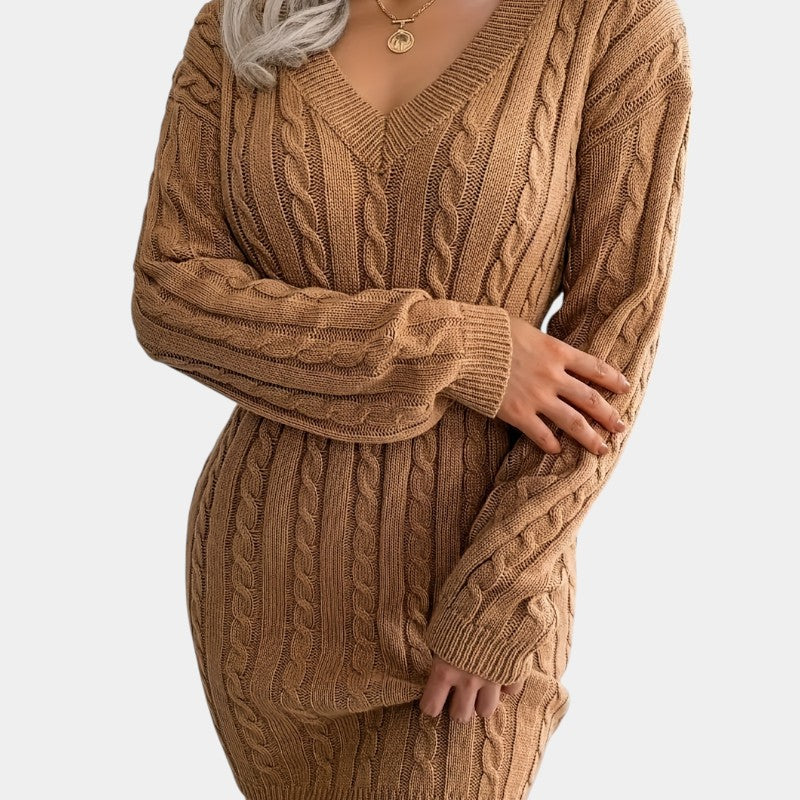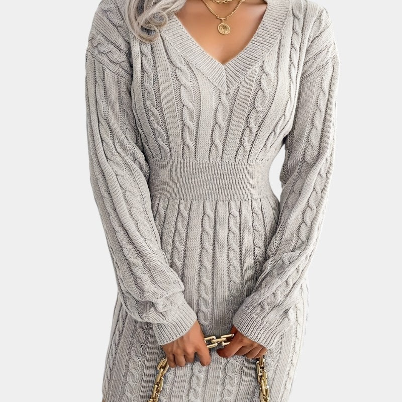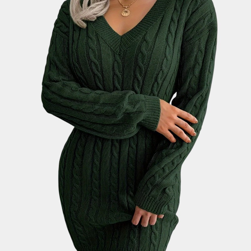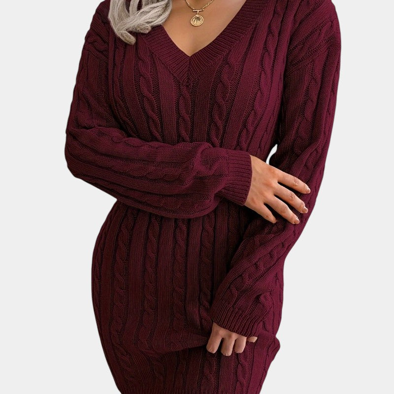 Gleame | Dames Trui Jurk Kabelpatroon V-Hals Lange Mouwen