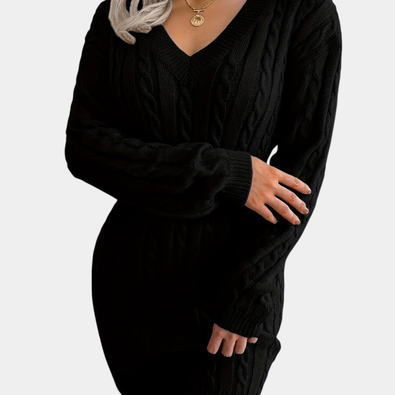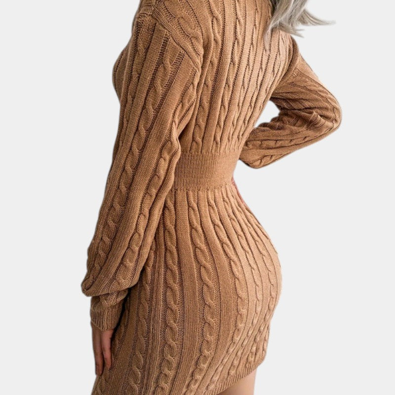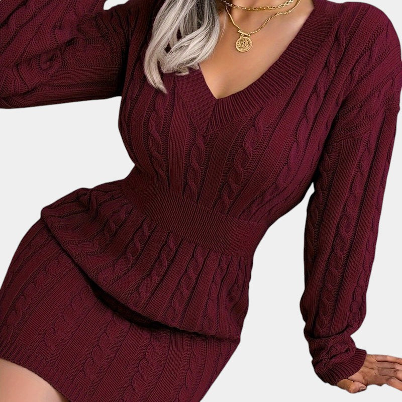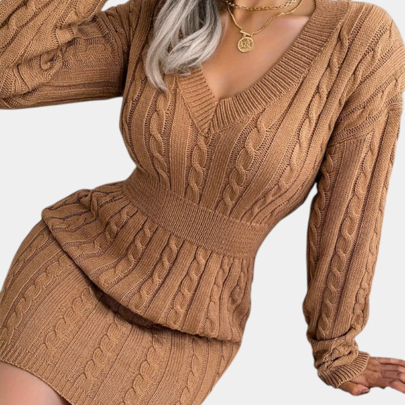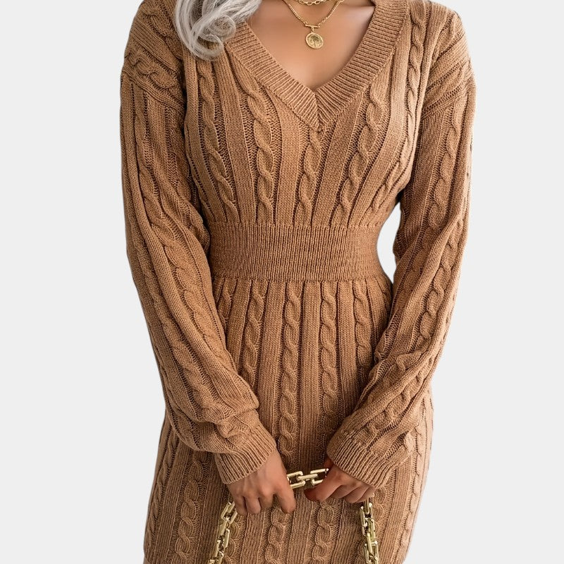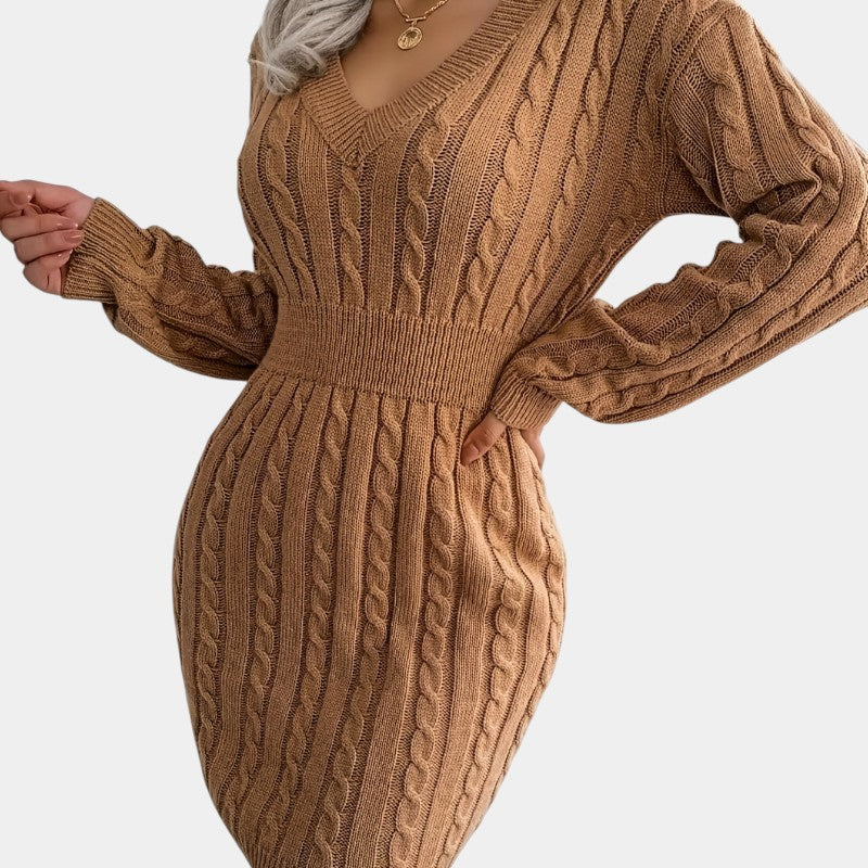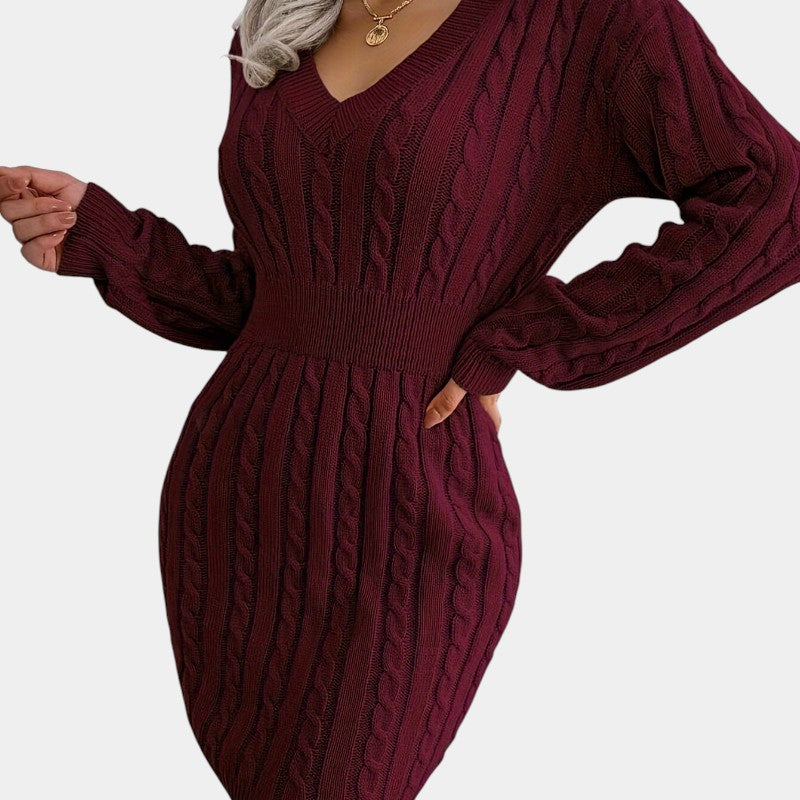 Gleame | Dames Trui Jurk Kabelpatroon V-Hals Lange Mouwen